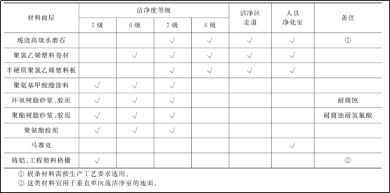 目前,各行各业的洁净室地面有多种多样的形式,常用的有水磨石地面、涂布型地面、粘贴型地面、各类活动地板和金属格栅通风地板等。各种洁净度等级和洁净厂房内各功能区的地面工程其材料选择可参照下表。