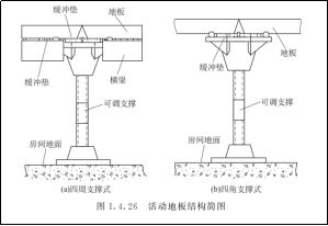 中对防静电活动地板的有关规定,在进行洁净室内活动地板的设计时,首先应合理选择活动地板的材质和支撑方式。按活动地板的支撑方式不同可分为四周支撑式和四角支撑式。四周支撑式活动地板一般由地板面板、可调支撑、横梁、缓冲垫等组成;四角支撑式通常由底板