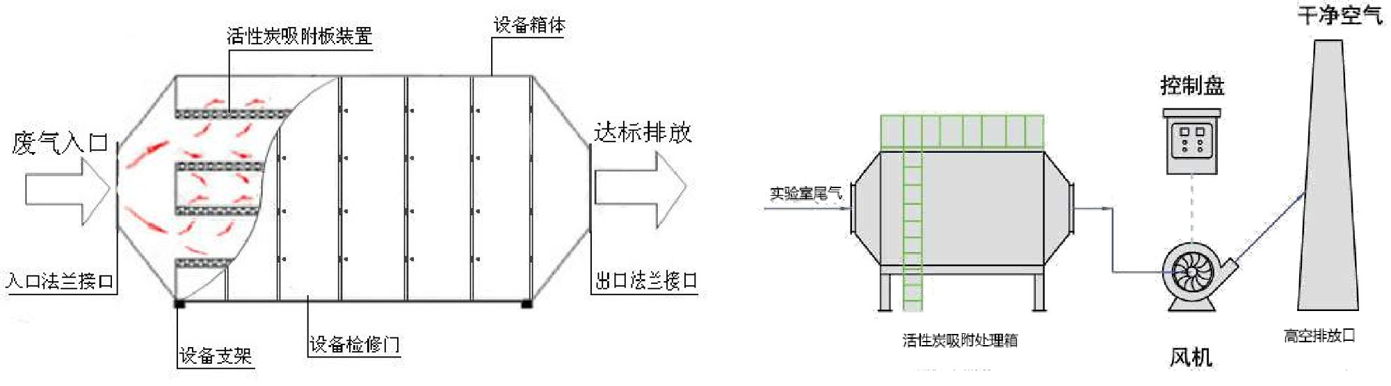 •活性炭吸附(利用活性炭表面极大,吸附性强的特点,又能有效的保护排风设备不被气体腐蚀)